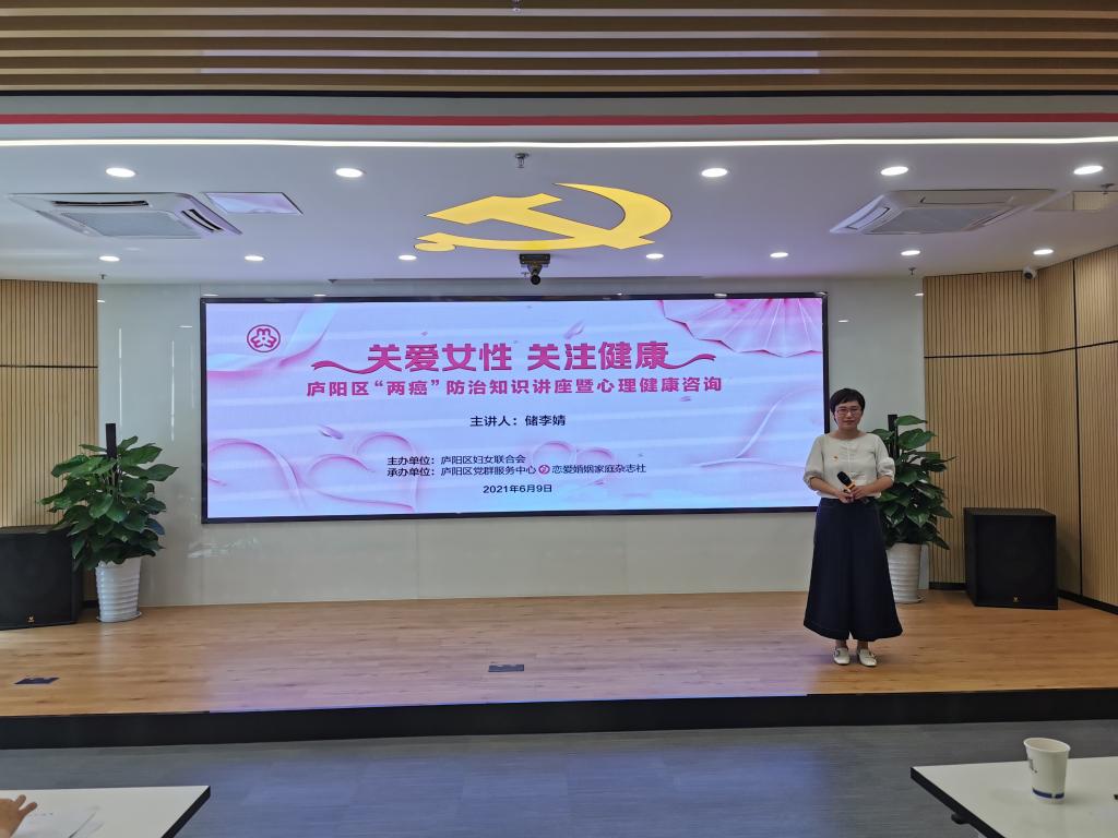 2021年6月9日上午,临床医学院党总支党员教师储李婧前往庐阳区党群服务中心,为辖区各级妇联人员开展了“关注女性疾病关爱女性健康”为主题“两癌”“早预防、早发现、早诊断、早治疗”知识科普讲座。