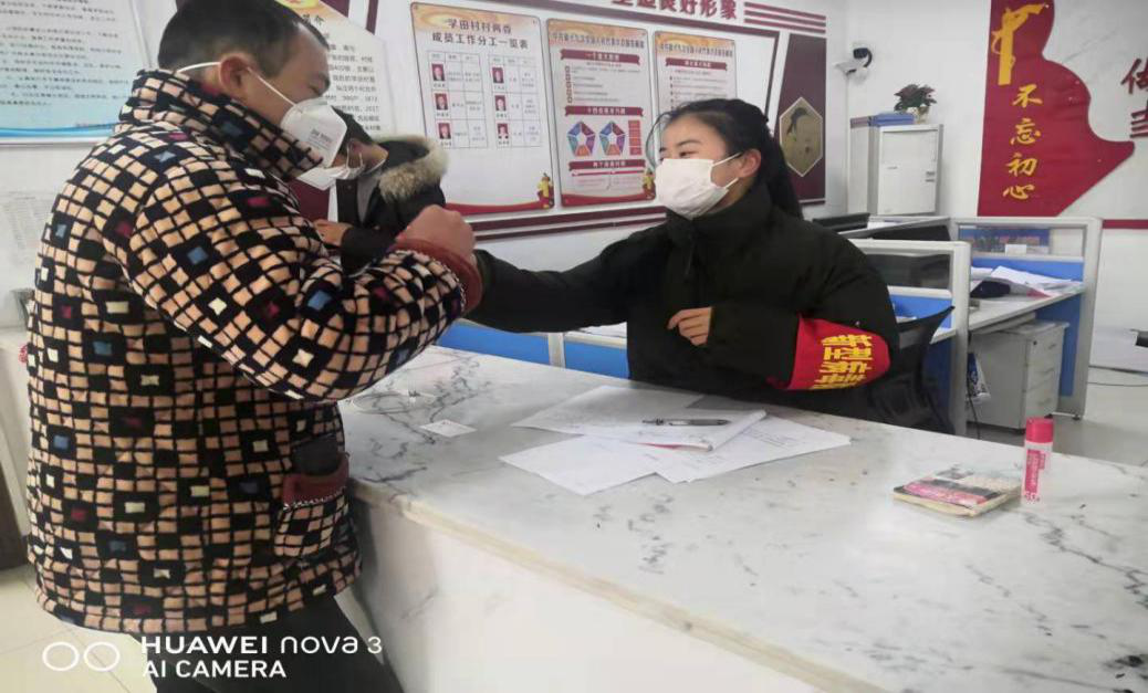 (图为刘雪晴同学在协助村民量体温)