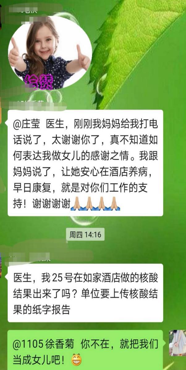老吾老以及人之老,幼吾幼以及人之幼。在日常工作中,庄莹医者仁心,视留观人员为亲人,通过微信群播报天气、转发暖心微视频等方式激励隔离人员以积极心态面对暂不确定的等待过程,给予患者心理和情感支持。14岁的初三学生王扬(化名)父母都因确诊被收治,看着孩子情绪低落,庄莹每天多次到他房间,送去酸奶、水果等食物,促膝长谈,帮他与父母视频连线。她写小纸条鼓励孩子:“别害怕,困难是暂时的,就把我当成你姐姐”。独自在隔离点的老人黄女士心中,庄莹就如同女儿。工作之余,庄莹时常守护在老人身边,嘘寒问暖,充当跑腿。得知老人生日,庄莹和同事们自发组织为老人过寿,老人的女儿得知后连连发来微信感谢:“太感谢你了,要不是你在,我实在不知道我母亲该如何是好”!