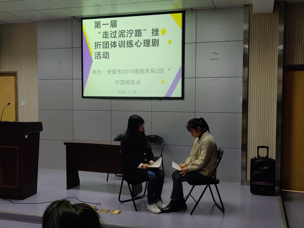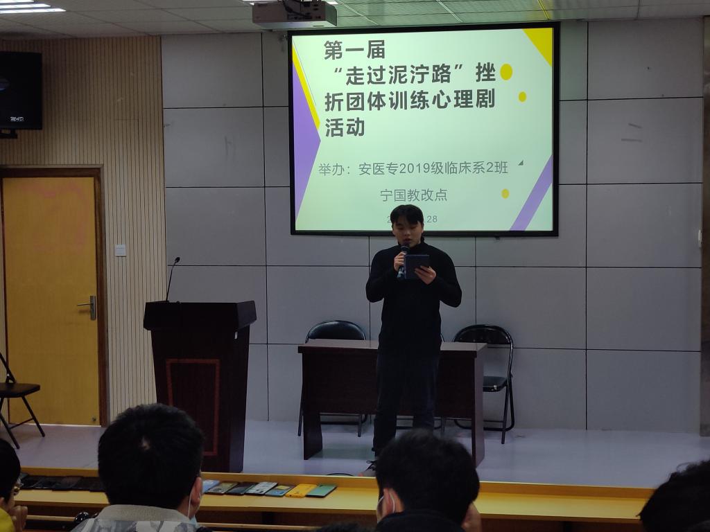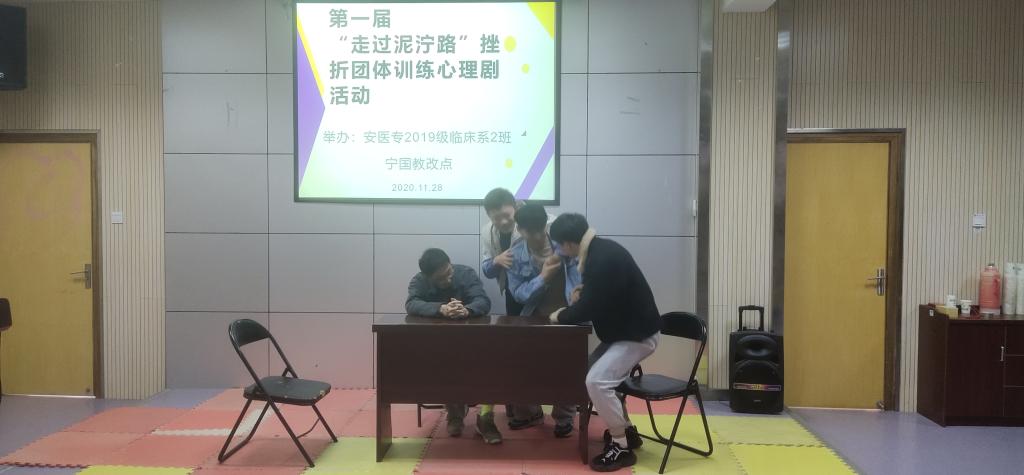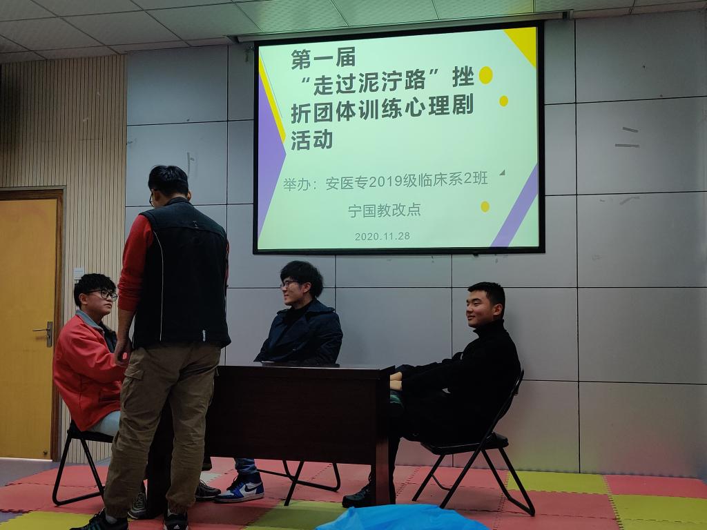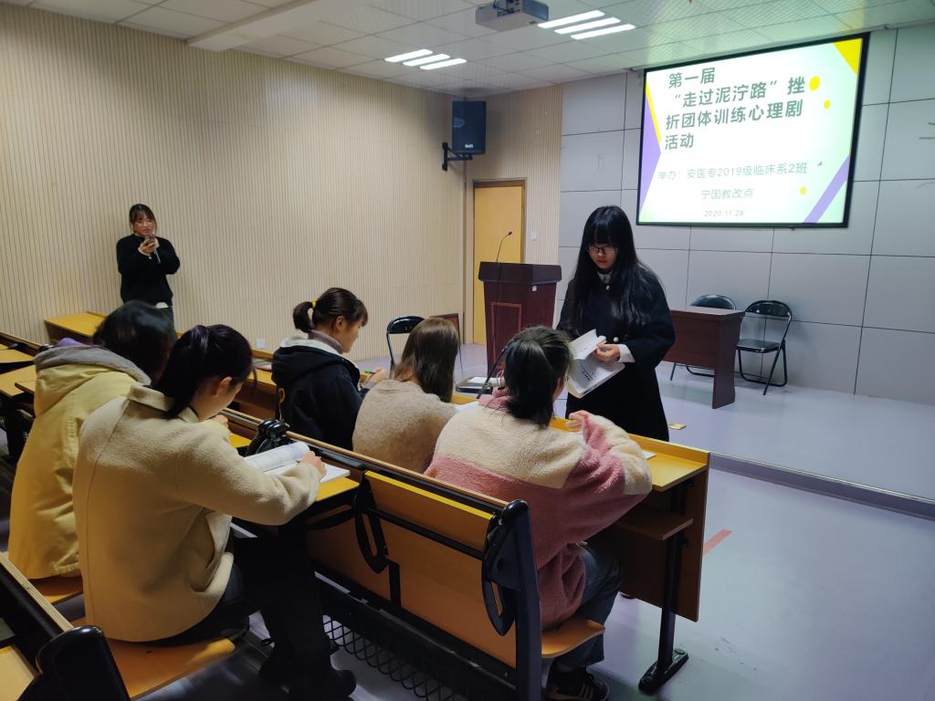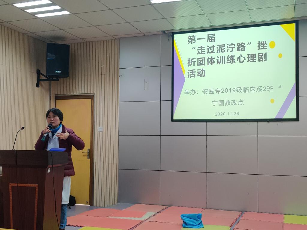 为了帮助学生正确认识和面对压力,提升挫折应对能力,2020年11月28日上午在宁国市人民医院西区阶梯教室,教改点班主任袁丽华老师组织同学们开展了一次心理建设暨挫折团体训练活动。