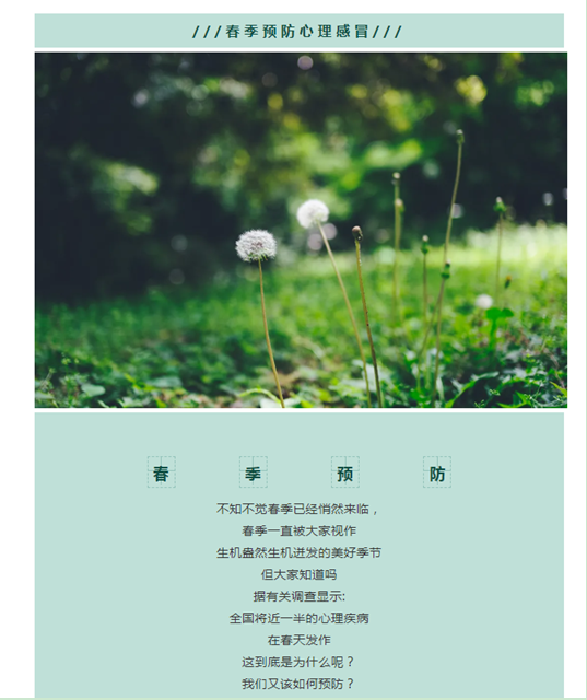 3月1日学生返校以来,我院心理二级辅导站基于心理普测筛查结果,对在校学生心理状态再次进行筛查,安排心理老师、各班级辅导员针对异常学生进行一对一心理访谈,一方面对心理异常学生做到心中有数,另一方面贴心的帮助学生疏解心理压力,做好心理危机早期干预。针对较为严重的学生,帮助其预约学校的心理健康中心进行心理咨询。另外,结合公众号线上平台,开设“心之桥”栏目,发布春季预防心理“感冒”小贴士,运用学生喜闻乐见的方式,帮助学生了解如何稳定情绪、保持心理健康、预防心理疾病的心理知识。